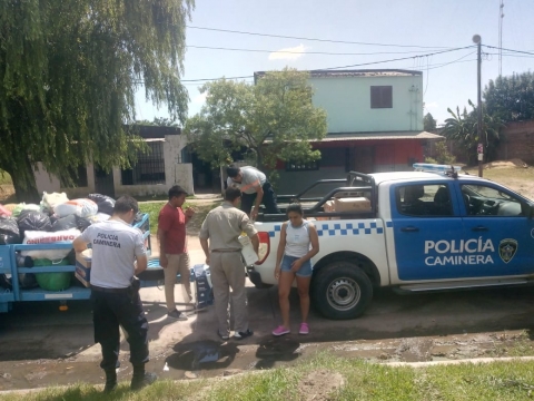 En la mañana del domingo, la Dirección General de Policía Caminera a cargo del Comisario Mayor Hugo Villasanti, brindó colaboración en el traslado de bolsones destinados a familias del Barrio Takay que une las ciudades de Fontana y Puerto Tirol por medio de un móvil policial camioneta Ford Ranger y un carretón junto a empleados pertenecientes a la Institución Policial.
