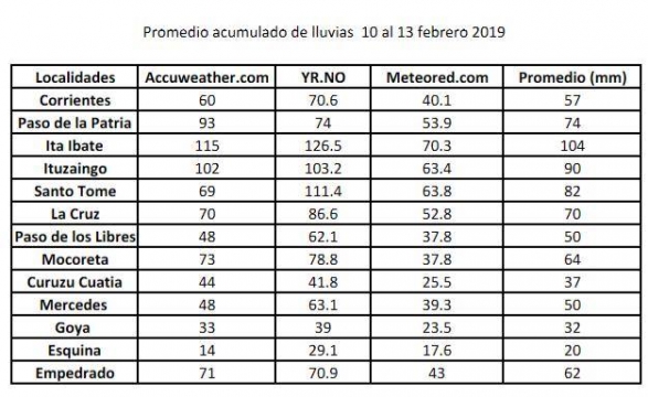 La información obtenida de tres fuentes se vuelca en el cuadro que se adjunta, con el promedio de las precipitaciones previstas para esos días.