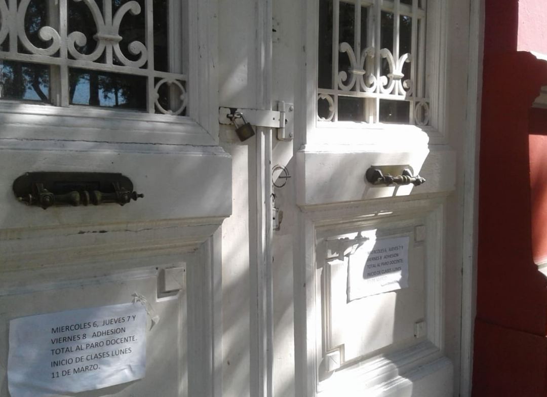 Un cartel en la escuela Zorrilla rezaba «Miércoles 6, Jueves 7 y Viernes 8, Adhesión total al paro docente. Inicio de clases lunes 11 de marzo». Y un candado daba cuenta de que el establecimiento estaba cerrado.