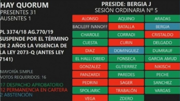 En tal sentido, votaron a favor de la suspensión Elida Cuesta, Nadia García Amud, Ricardo Sánchez, Enrique Paredes, Andrea Charole, María Elena Vargas, Marita Fonseca, Rubén Aquino, Liliana Spoljaric; Carim Peche, Leandro Zdero, Livio Gutiérrez, Gustavo Corradi, Leandro Aradas, Carmen Britto, Irene Dumrauf, y Luis Obeid.