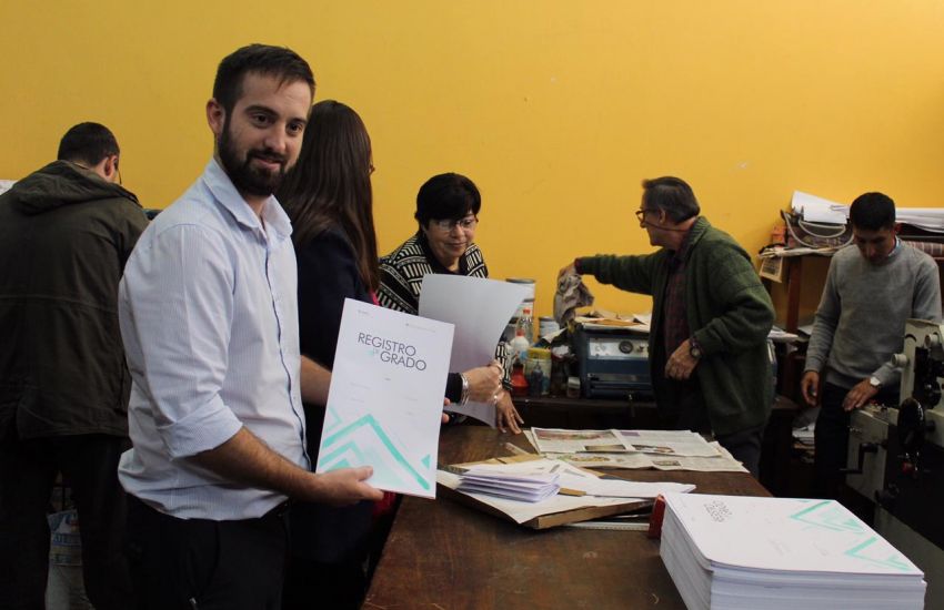 Jorge Riquelme, del equipo técnico de la imprenta, manifestó: «Nosotros trabajamos en conjunto con la Dirección de Documentación, con los diseñadores específicamente, ellos se encargan del armado y la corrección a su vez de dicho trabajo. En este momento, nosotros estamos con el armado de Registros de Grado, ya llevamos hechas 1500 unidades, aproximadamente. Del papel vegetal va a la chapa, de la chapa a la máquina, así es el proceso. Recibimos insumos, papel y máquinas nuevas, ahora podemos trabajar».