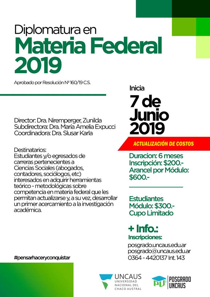 Universidad Nacional del Chaco Austral, a través de Secretaría Académica- Área de Posgrado, abrió inscripciones para la Diplomatura en Materia Federal, que comenzará el próximo 6 de junio de 2019, en el Aula Magna de la Institución. La misma se extenderá hasta el mes de diciembre del corriente año y otorgará certificados de asistencia.