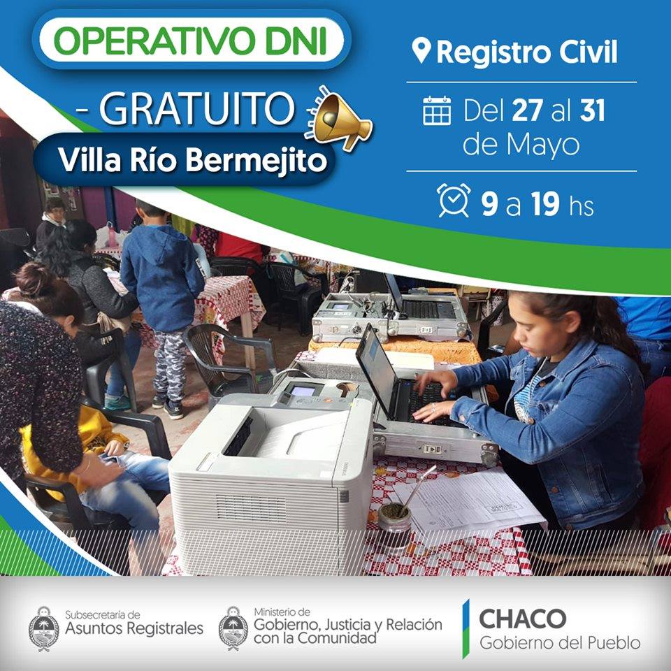 El Ministerio de Gobierno, Justicia y Relación con la Comunidad realiza, esta semana, operativos gratuitos de regularización del Documento Nacional de Identidad (DNI) en el barrio Primavera y en Villa Río Bermejito. De esta manera, continúan los operativos para que las vecinas y vecinos comprendidos en la emergencia hídrica puedan tramitar el DNI sin costo.