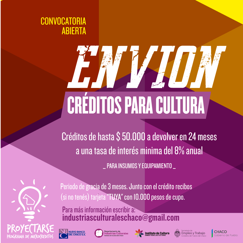 El Instituto de Cultura del Chaco, a través de su departamento de Industrias Culturales (Don Bosco 756), anunció el lanzamiento de la línea Envión, créditos para la cultura. Esta iniciativa tiene como fin fortalecer el desarrollo de emprendimientos culturales, generar empleo, fortalecer emprendedores e impulsar los sectores de la economía creativa.