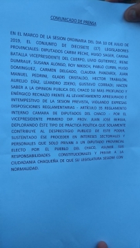 Además, afirmaron que «este tipo de práctica política solamente contribuye al desprestigio público de este poder, sustentado ese proceder en intereses sectoriales y personales que solo privan a un diputado provincial electo por el pueblo del Chaco, asumir sus responsabilidades constitucionales y privar a la ciudadanía chaqueña de que su Legislatura sesiones con normalidad».