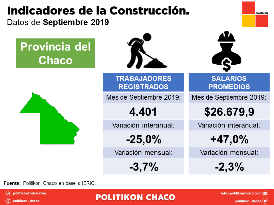 En el Chaco, el salario promedio en el sector de la construcción fue de $26.679,9, creciendo un 47% interanual, siendo así el incremento más bajo de todo el NEA. Además, dicho crecimiento está por debajo de la inflación interanual (septiembre 2018 a septiembre 2019) para la región del NEA, que fue del 55,7%, por lo cual, los salarios quedaron 8,7 puntos por debajo de la inflación, teniendo así una marcada caída en términos reales.
