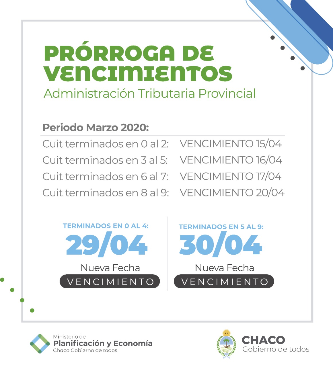Es así que el vencimiento de los Ingresos Brutos Locales y Fondos de Salud fueron prorrogados, hasta el 29 de abril de 2020 para los CUIT finalizados del 0 al 4 y hasta el 30 de abril de 2020 para los CUIT finalizados del 5 al 9.