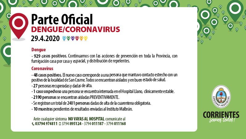 El nuevo parte epidemiológico, brindado por el Ministerio de Salud correntino indica que en las últimas 24 hs se registró un nuevo caso positivo de coronavirus, el cual es una persona que mantuvo contacto estrecho con el caso de San Cosme. De esta manera, la cifra de diagnosticos positivos asciende a 48.
