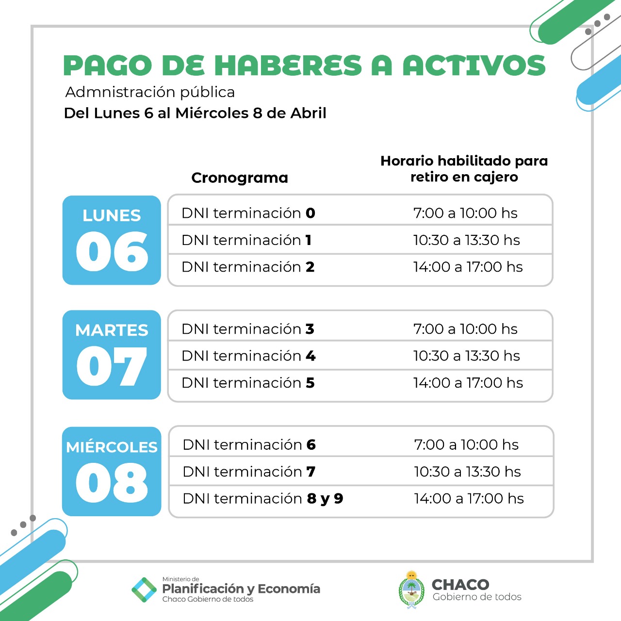 Tal y como lo anunció el gobernador Jorge Capitanich, se inició esta mañana el pago escalonado de salarios para los trabajadores activos de la administración pública con documentos terminados en 0, 1 y 2. Los mismos podrán retirar dinero en cajeros automáticos según corresponda su horario designado para evitar aglomeraciones, y en el marco del operativo Cobro seguro.