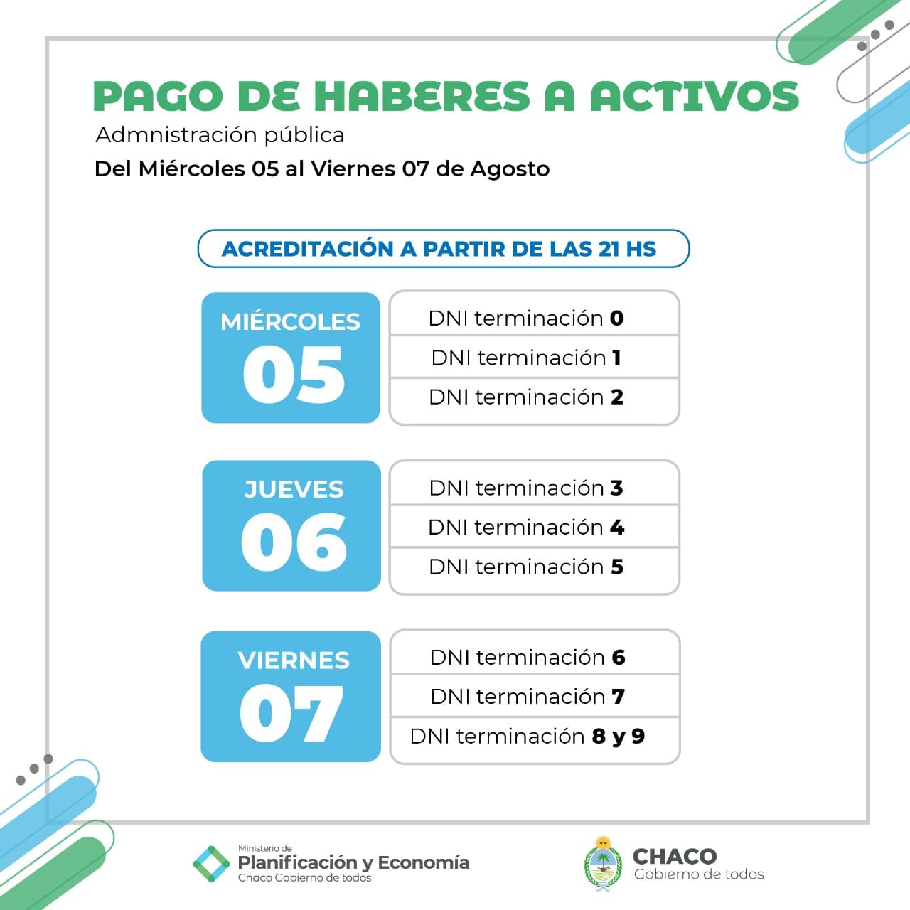 El pago de haberes para trabajadores activos de la administración pública comenzará el día miércoles 5, para aquellos cuyo DNI finalicen con los números 0,1 y 2. El horario habilitado para el retiro por cajero será organizado de la siguiente forma: para aquellos cuyos DNI finalicen en 0, podrán hacerlo desde las 7:00 a las 10:00; para aquellos cuyos DNI finalicen en 1, podrán retirarlo por cajero desde las 10:30 a las 13:30 y para aquellos con DNI finalicen en 2, podrán hacer el retiro por cajero desde las 14:00 a las 17:00.