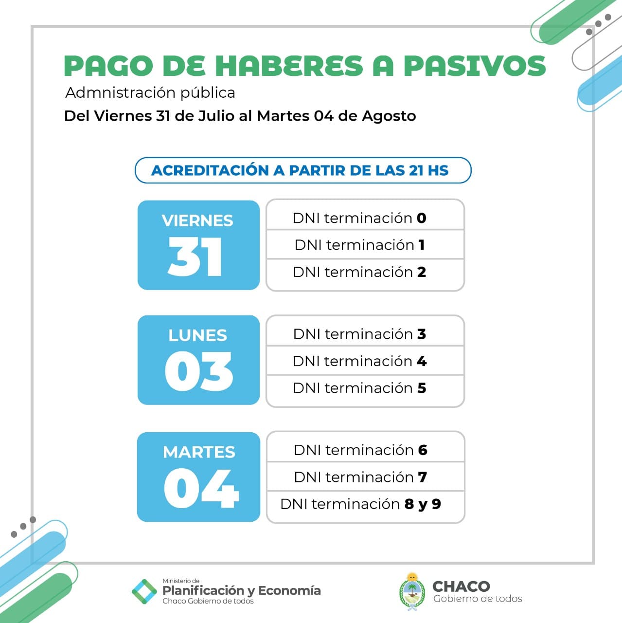El cronograma continuará el día lunes 3 de agosto con el pago de haberes para los trabajadores pasivos cuyos DNI terminen en 3, 4 y 5. Todos aquellos con DNI que finalicen con 3, el horario habilitado para retiro por cajero será de 7:00 a las 10:00; aquellos con DNI finalizados en 4, el horario habilitado es de 10:30 a 13:30 y aquellos con los DNI terminados en 5, el horario será de 14:00 a 17:00.