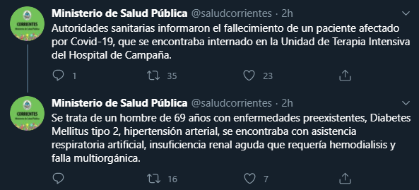 Cerca de las 13, la cartera sanitaria correntina confirmaba mediante las redes sociales que la provincia llegaba a su cuarto deceso por coronavirus desde el comienzo de la pandemia, ya que un hombre de 69 años pereció en la Unidad de Terapia Intensiva del hospital Campaña.