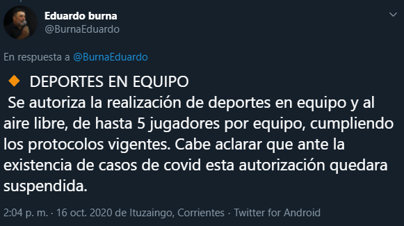 Cerca de las 14, el intendente de la localidad, Eduardo Burna, comunicó mediante sus redes sociales las flexibilizaciones que fueron habilitadas tras la última reunión del Comité de Crisis.