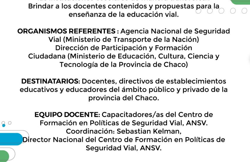 Desde este miércoles se encuentra abierta la inscripción para las capacitaciones virtuales en educación vial dirigida a docentes de la provincia del Chaco. La propuesta es gratuita y responde al objetivo de promover el abordaje transversal de la educación vial en las instituciones escolares, brindando contenidos y propuestas útiles. El dictado estará a cargo de la Agencia Nacional de Seguridad Vial.