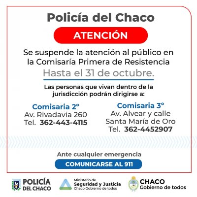 Ante cualquier situación, los vecinos de la zona pueden dirigirse a la Comisaria Segunda que se encuentra en avenida Rivadavia al 260 (Teléfono 362- 443415 o a la Comisaria Tercera ubicada en Santa María de Oro y Alvear (Teléfono 362-4452907).
