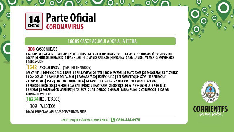 El ministerio de Salud de la provincia de Corrientes informó que, en las últimas 24 horas se produjeron 303 contagios de Covid-19, de los cuales 184 de estas personas residen en la capital; 10 en Bella Vista, 1 en Concepción, 2 en Empedrado, 4 en Esquina, 6 en Goya, 6 en Ituzaingó, 5 en Juan Pujol, 4 en Lomas de Vallejos, 21 en Mercedes, 24 en Monte Caseros, 14 en Paso de los Libres, 2 en San Luis, 10 en Virasoro, 1 en Pueblo Libertador.