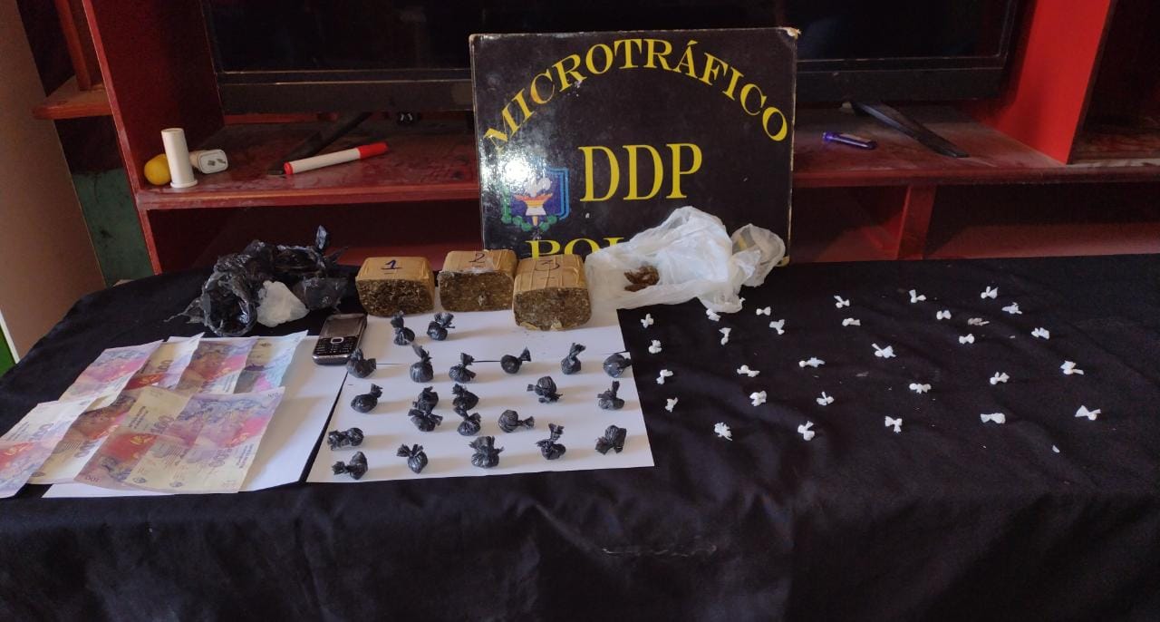 De esta manera, durante los allanamientos los agentes policiales incautaron un total de 59 envoltorios de polietileno conteniendo 235 gramos de cocaína, 22 envoltorios conteniendo 228,39 gramos de marihuana y $62.000 pesos en efectivo. Además, un arma de fuego tipo Pistolón Calibre 20, unamotocicleta Mondial 110cilindradas, una Tv Smart de 49”, tres balanzas digitales y varios recortes de polietileno.