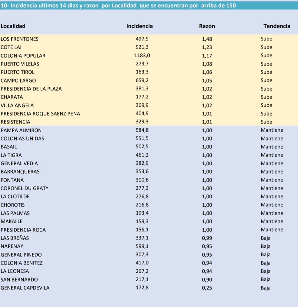 Resistencia, Los Frentones, Cote Lai, Colonia Popular, Puerto Vilelas, Puerto Tirol, Campo Largo, Presidencia de la Plaza, Charata, Villa Ángela, Sáenz Peña y Presidencia de la Plaza, son las localidades donde la incidencia de casos y tendencia se mantiene en aumento en los últimos 14 días.