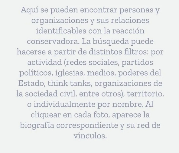 «La búsqueda puede hacerse a partir de distintos filtros: por actividad (redes sociales, partidos políticos, iglesias, medios, poderes del Estado, think tanks, organizaciones de la sociedad civil, entre otros), territorio o individualmente por nombre», detallaba la polémica página.