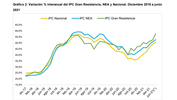 De hecho, hay un dato que agrava todavía más la situación: el 57,7% de inflación interanual de junio 2021 para el Gran Resistencia es el registro más alto de 2017 a la fecha para el aglomerado chaqueño.