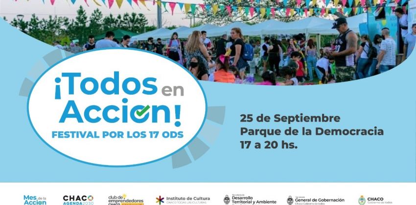 El Gobierno de la provincia del Chaco invita este sábado 25 de septiembre al festival ¡Todos en Acción!, que se desarrollará en el Parque de la Democracia desde las 17 horas. Se trata de una propuesta para celebrar el día internacional de la acción por los 17 Objetivos de Desarrollo Sostenible (ODS).