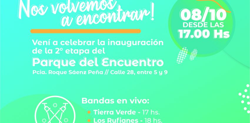 Será a partir de las 17 en el Parque del Encuentro donde se inaugurará la segunda etapa que incluyó diversos senderos, juegos y pista de skate, además, de la pavimentación e iluminación de las cuadras circundantes. Habrá actuaciones en vivo de Tierra Verde, Los Rufianes y Los Chaques.