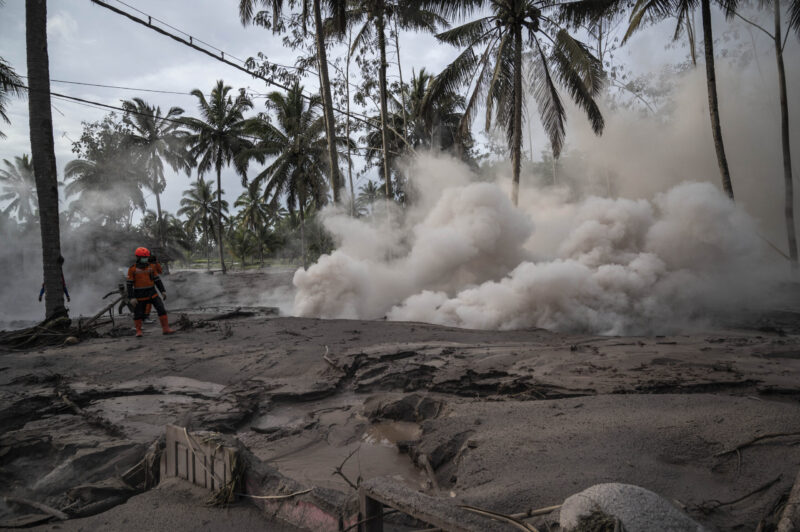 La lava destruyó al menos un puente en Lumajang, con lo que hay zonas donde los equipos de rescate no pueden llegar.