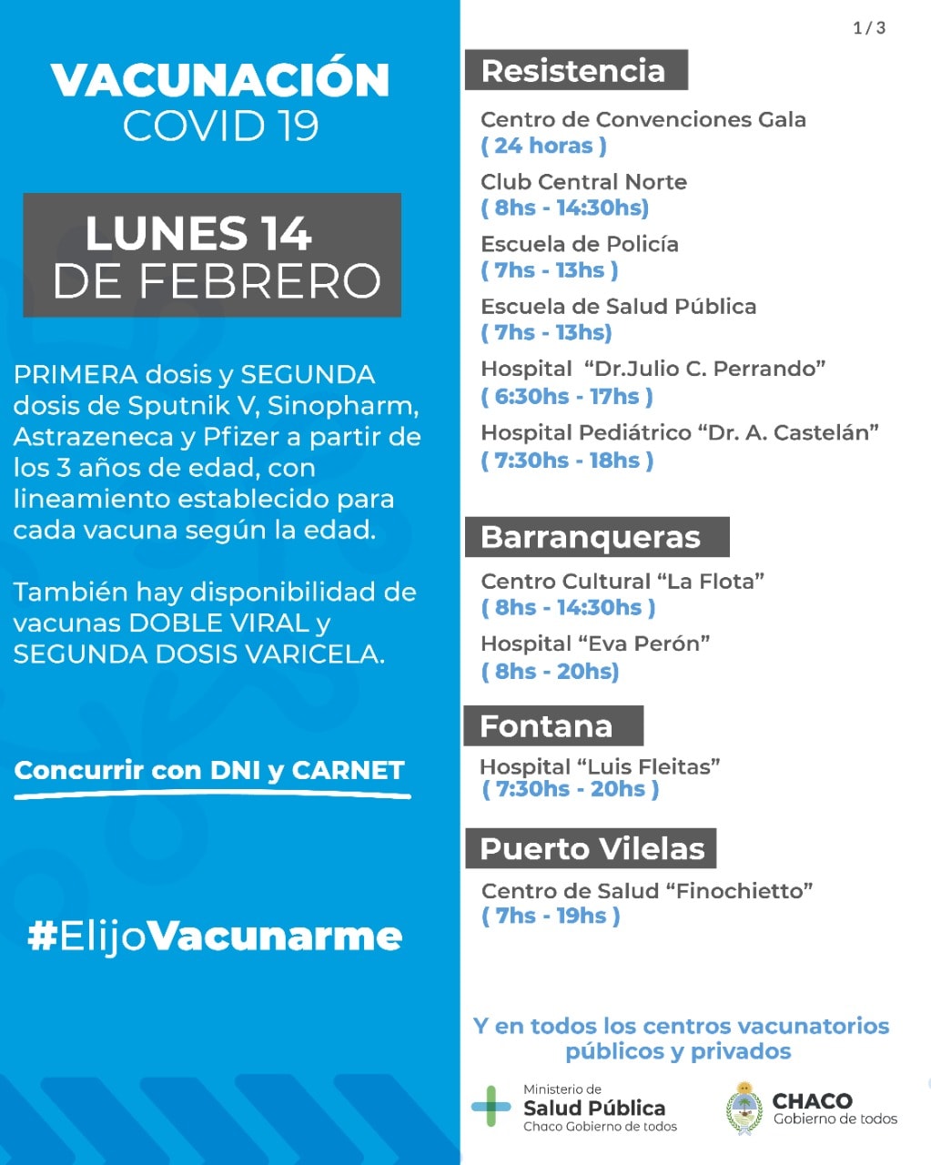 El Ministerio de Salud de la provincia dio a conocer las postas de vacunación contra COVID-19 para este lunes 14 de febrero en el Gran Resistencia.