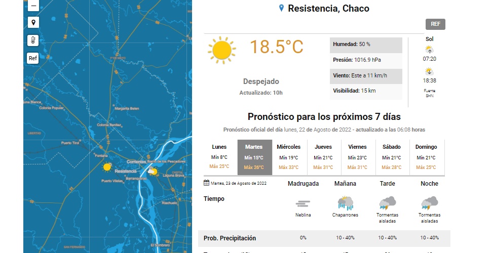 Para el miércoles, se observarán mejoras con cielo parcialmente nublado, viento del cuadrante Norte. Una mínima de 19 grados y una máxima de 33, siendo el día más caluroso de la semana en el Gran Resistencia.