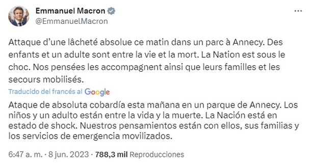 El presidente de Francia, Emmanuel Macron, publicó un mensaje en sus redes sociales: «Ataque absolutamente cobarde esta mañana en un parque en Annecy. Varios niños y un adulto están entre la vida y la muerte. La nación está conmocionada».