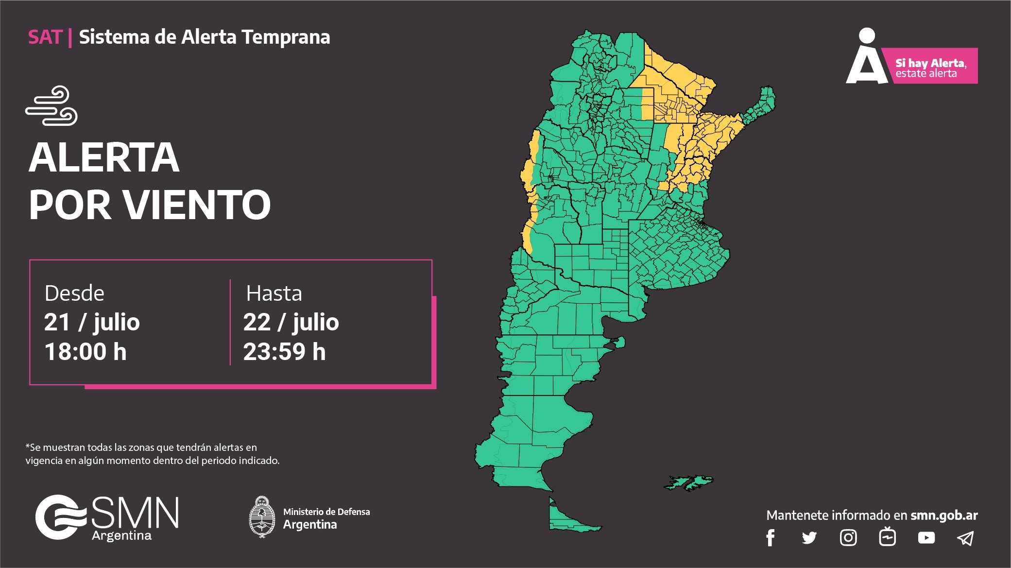 El organismo indicó que el área bajo alerta será afectada por vientos del sector norte, con velocidades entre 40 y 50 km/h y ráfagas de hasta 80 km/h.