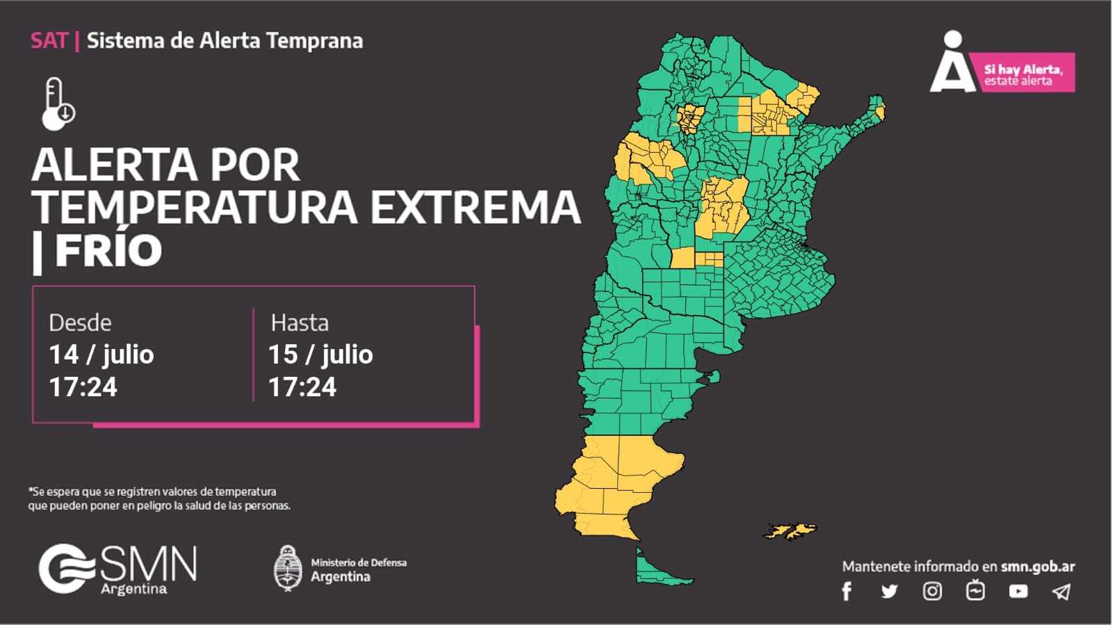 El Servicio Meteorológico Nacional (SMN) extendió hasta este sábado la alerta amarilla por bajas temperaturas para varios departamentos de la provincia del Chaco. Según detalla el organismo nacional, el nivel amarillo implica un efecto leve a moderado en la salud, es decir, los registros térmicos pueden ser peligrosos, sobre todo para los grupos de riesgo, como niños y niñas, personas mayores de 65 años, con enfermedades crónicas.