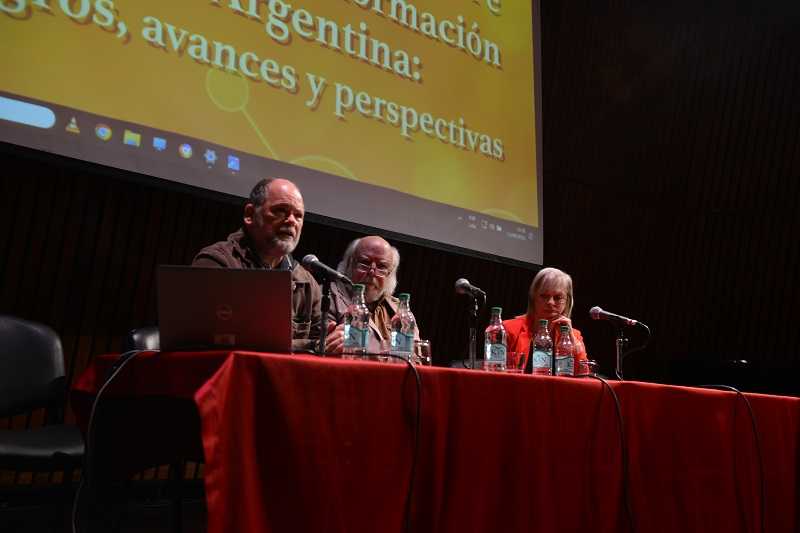 El jefe de Gabinete de Asesores del Ministerio de Cultura de la Nación, Esteban Falcón; el director de la Biblioteca Nacional, Juan Sasturain, y la subdirectora de la Biblioteca Nacional, Elsa Rapetti, dieron apertura a la jornada.