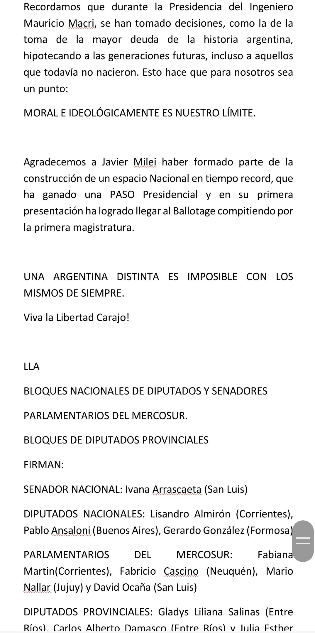 Diputados y senadores de La Libertad Avanza (LLA) manifestaron su desacuerdo con la alianza electoral con Juntos por el Cambio y recordaron que «durante la presidencia de Mauricio Macri se tomó la mayor deuda de la historia hipotecando a las generaciones futuras» En este marco, le pusieron un límite a Javier Milei de cara al balotaje de las elecciones 2023. «Una Argentina distinta es imposible con los mismos de siempre», advirtieron en un comunicado oficial.