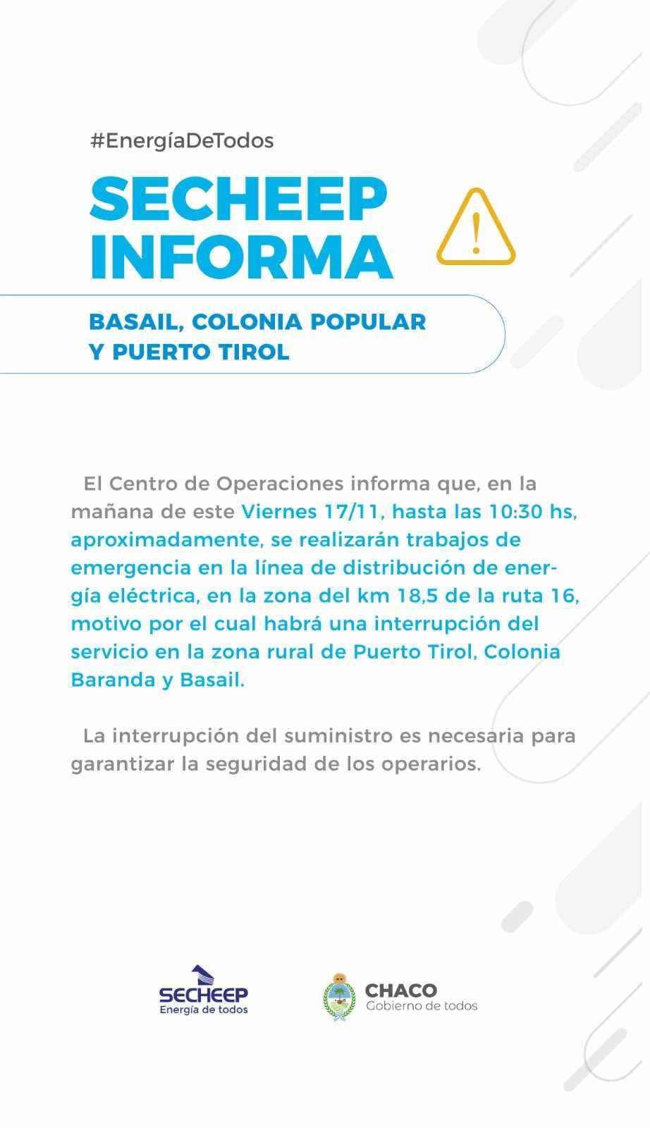El Centro de Operaciones de la empresa Secheep informó en un comunicado que “en la mañana de este viernes 17, hasta las 10:30, aproximadamente, se realizarán trabajos de emergencia en la línea de distribución de energía eléctrica, en la zona del km 18,5 de la ruta 16, motivo por el cual habrá una interrupción del servicio en la zona rural de Puerto Tirol, Colonia Baranda y Basail”.