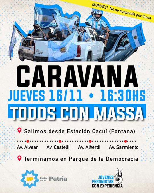 Unión por la Patria cerrará su campaña en Chaco este jueves 16 de noviembre con una caravana bajo la consigna «Todos con Massa». La actividad, que no se suspenderá por lluvia, iniciará a las 16:30.