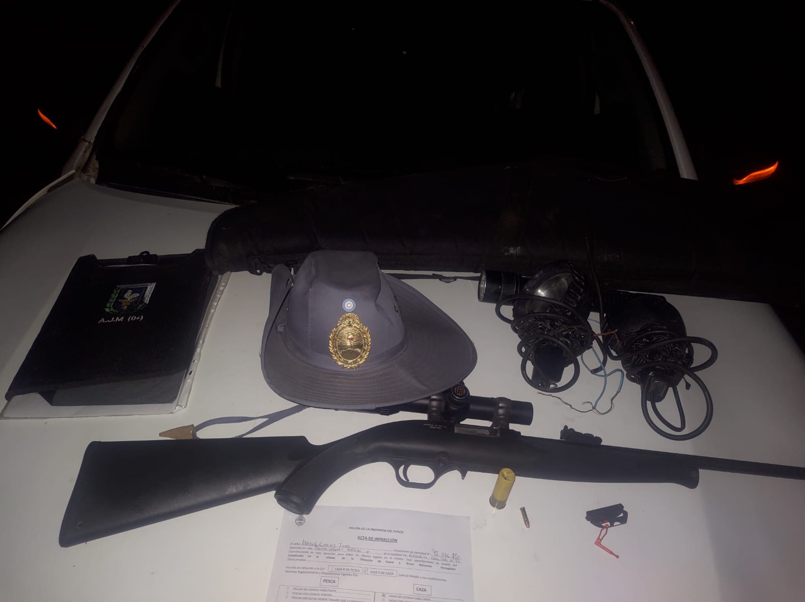 Procedieron al secuestro de un rifle, un cartucho calibre 22, un cartucho calibre 16, una linterna y dos reflectores.