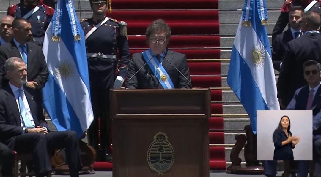 «Hoy comienza una era de paz y prosperidad, de libertad y progreso», expresó Milei al pronunciar su primer discurso como mandatario en las puertas del Congreso, tras haber prestado juramento en su cargo ante la Asamblea Legislativa.