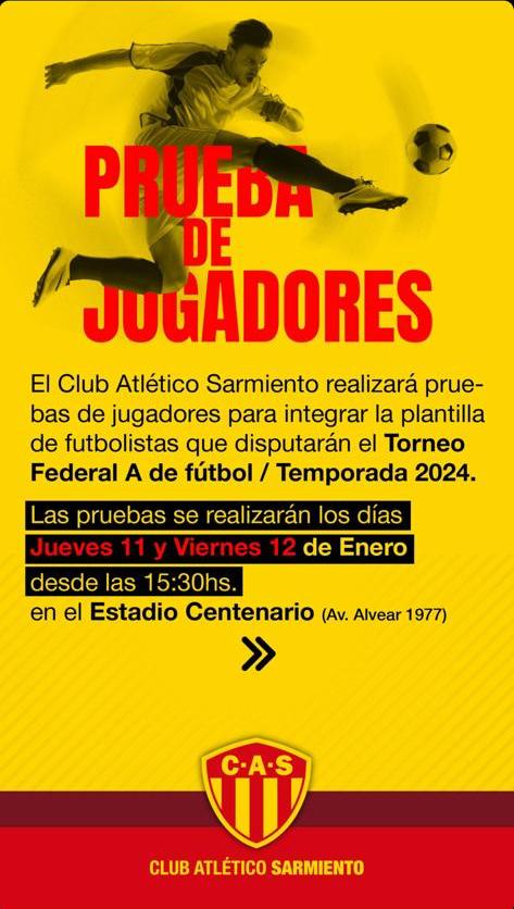 Este jueves y viernes el cuerpo técnico de Sarmiento, encabezado por el flamante DT de la institución Raúl Valdez, realizará una prueba de jugadores, para poder incorporarlos al plantel profesional del Torneo Federal “A”. La misma se llevará adelante en el Estadio Centenario, a partir de las 15:30.