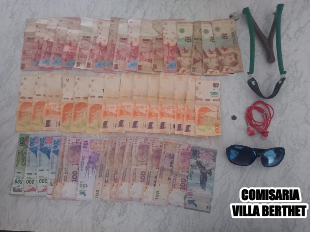 En poder del sospechoso, de 33 años, incautaron el dinero faltante, siendo un total de 16.570, anteojos, una gomera, un auricular y además tres plantas de marihuana.