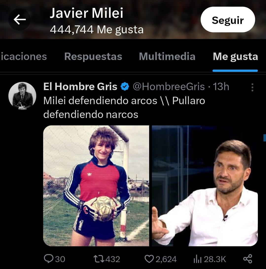 Luego, el Presidente redobló una vez más su diatriba contra Pullaro al favear una publicación donde figura joven junto al mandatario santafesino y dice: «Milei defendiendo arcos, Pullaro defendiendo narcos».