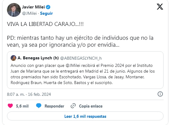 «¡Viva la libertad carajo! PD: mientras tanto hay un ejército de individuos que no la ven, ya sea por ignorancia o por envidia», expresó Milei en su cuenta personal de la red social X (antes Twitter), al celebrar la entrega del premio.