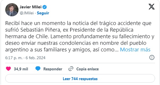 «Lamento profundamente su fallecimiento y deseo enviar nuestras condolencias en nombre del pueblo argentino a sus familiares y amigos, así como también a todo el pueblo chileno», indicó Javier Milei.