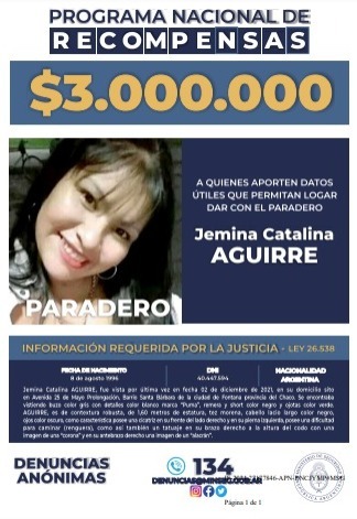 Si tenes datos sobre Jemina comunicate de forma anónima a la Línea 134, con el Equipo Fiscal N° 11 al 3624422226, o con la Comisaria Tercera Fontana al 3624385590.