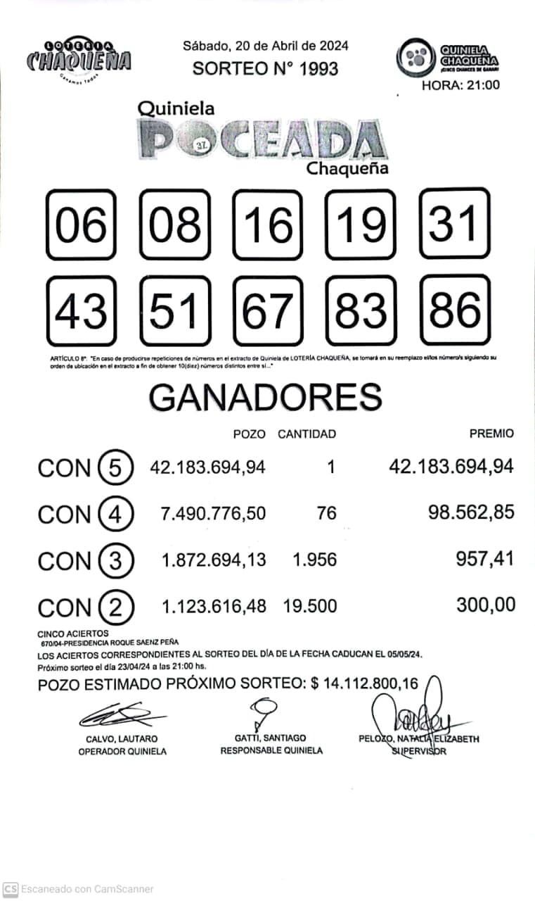Un vecino de Sáenz Peña se alzó con el premio de $42.183.693,93 de la Poceada Chaqueña, que se sorteó este sábado por la noche.