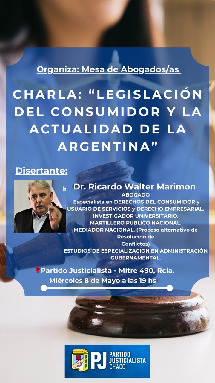 La mesa de abogados y abogadas del Partido Justicialista distrito Chaco, organiza la charla “Legislación del Consumidor y la actualidad de la Argentina” este miércoles 8 de mayo a las 19 en su sede Resistencia, Mitre 490.