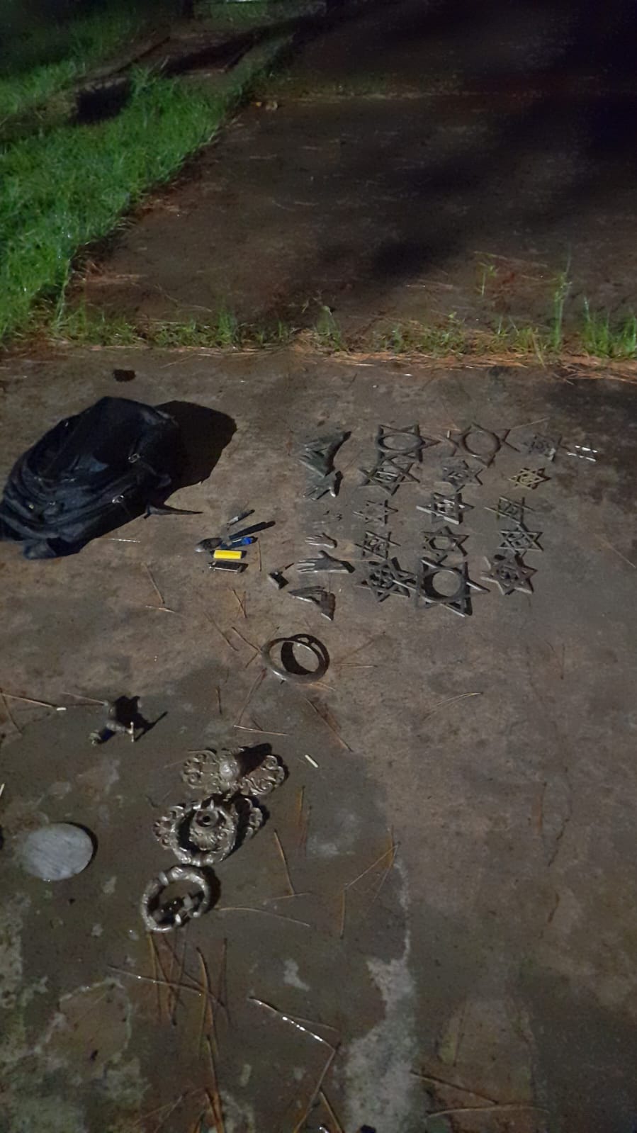 Durante la detención, detectaron que llevaba dentro de una mochila negra 27 piezas metálicas correspondientes a símbolos y decoraciones de tumbas, así como una canilla y una tela de color azul.