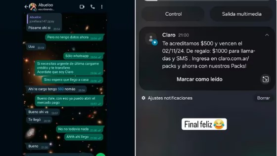 Cuando sucedió el intento de estafa, el joven se encontraba en la universidad y en ese momento no tenía datos en su celular por lo que no podía realizar la transferencia solicitada entonces le solicitó a su abuelo que le transfiera para realizar una carga le dijo “si necesitas urgente, de última, cárgame crédito y te transfiero. Si no espera que llego a casa“ y la respuesta que obtuvo fue que su “Abuelo“ podía pasarle 500 pesos al menos para poder ingresar a la aplicación de Mercado Pago.