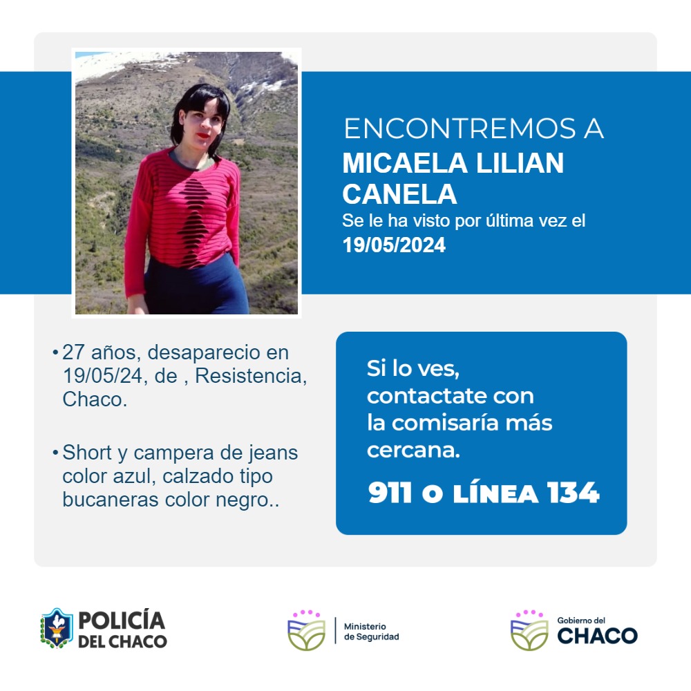 La Policía del Chaco en base a una denuncia registrada en Comisaria Primera Resistencia, solicita a la comunidad su valiosa colaboración de informar a la unidad policial más cercana cualquier información relacionada al paradero de Micaela Lilian Canela, de 27 años.
