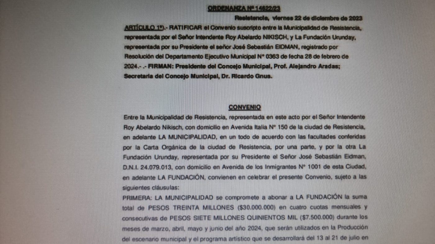 La Resolución N° 0363 firmada por el intendente Roy Nikisch a fines de febrero resolvió abonar 30 millones de pesos a la Fundación Urunday para actividades culturales en el marco de la Bienal Internacional de Esculturas a realizarse el mes que viene en la capital chaqueña.